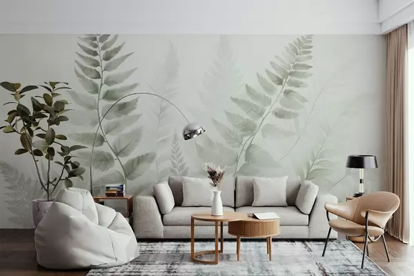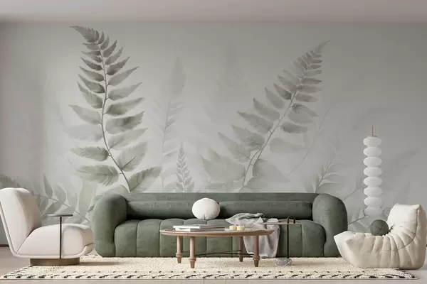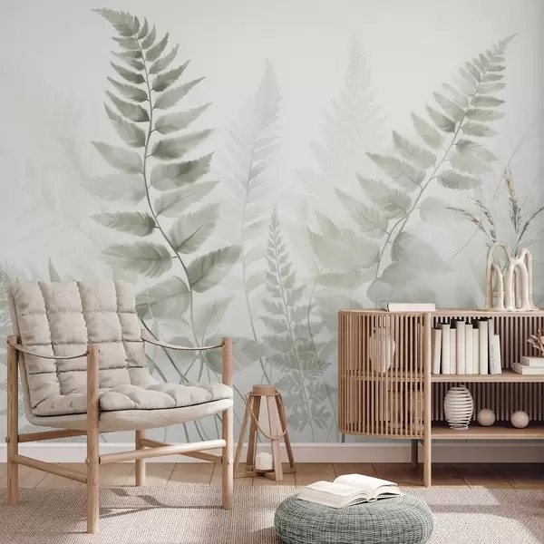 Фотошпалери Текстуровані сухі листя папороті різних відтінків зеленого кольору на м'якому світлому тлі в стилі акварелі. w09615v1