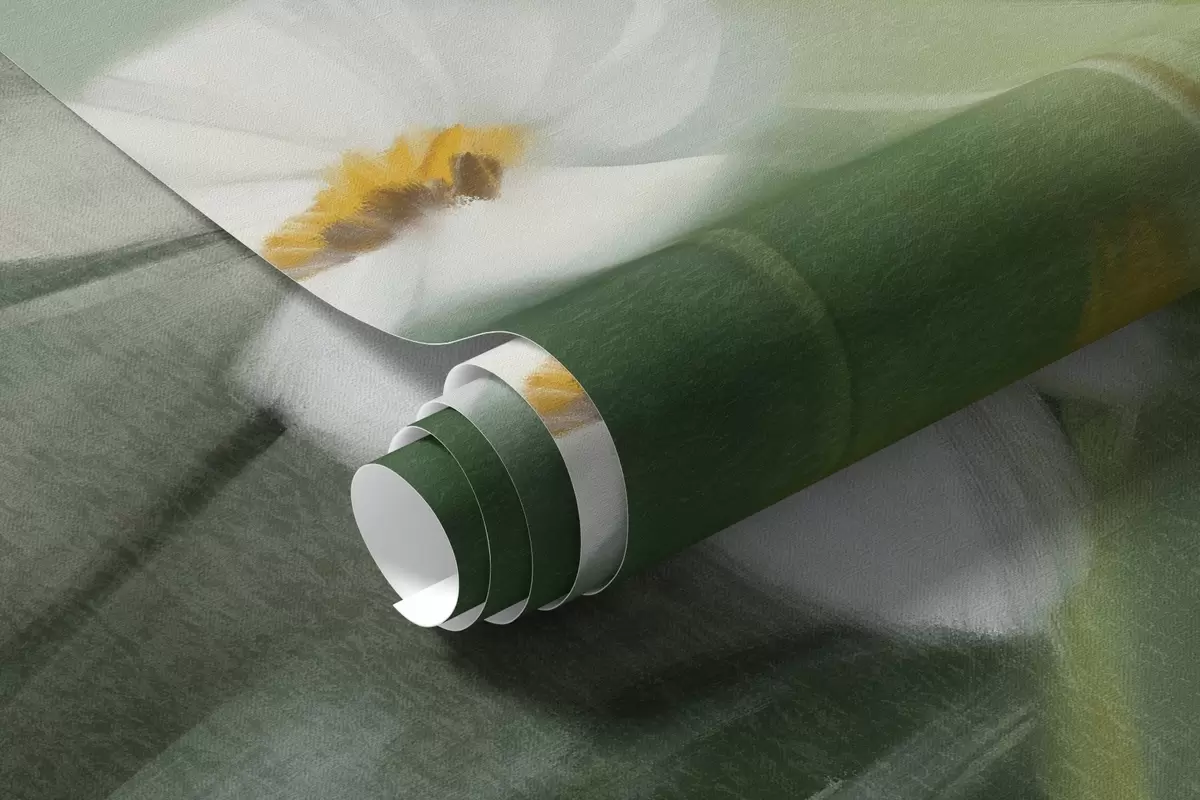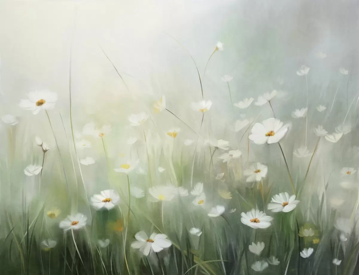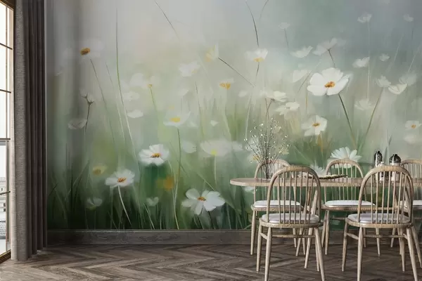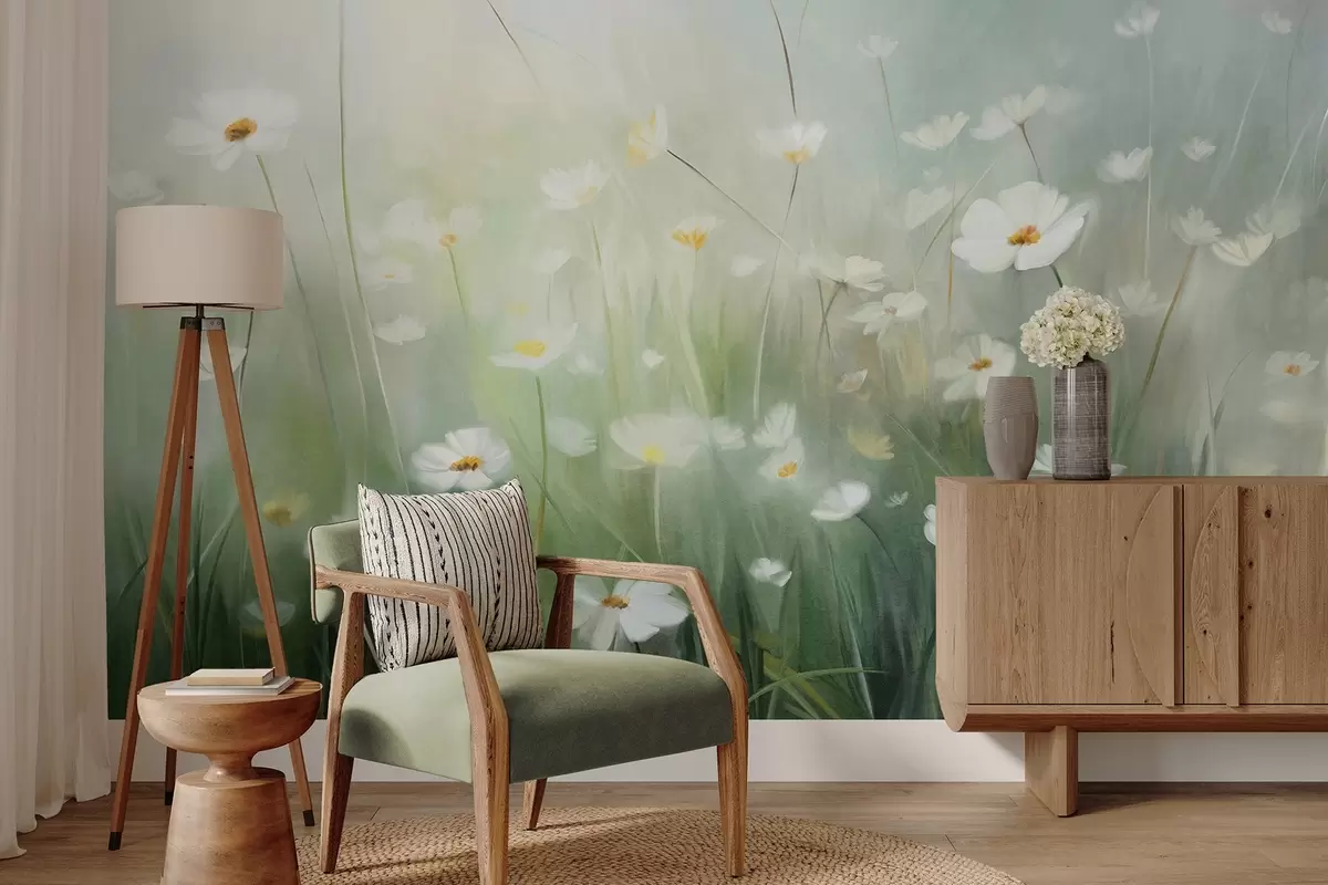 Фотошпалери Абстрактне поле білих ромашок із зеленою травою та м'яким, розмитим фоном у стилі живопису w09619