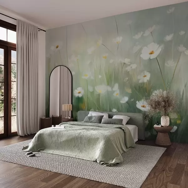 Фотошпалери Абстрактне поле білих ромашок із зеленою травою та м'яким, розмитим фоном у стилі живопису w09619