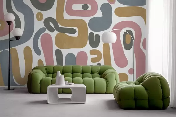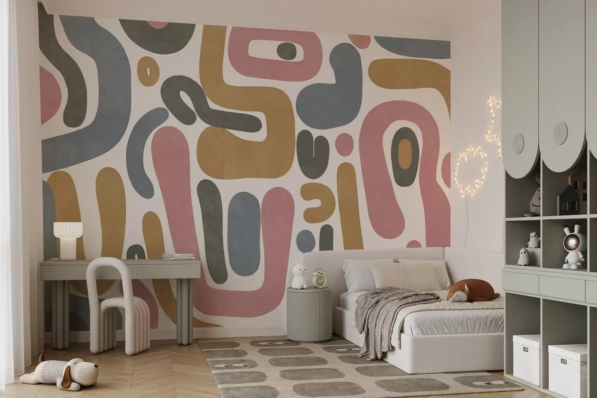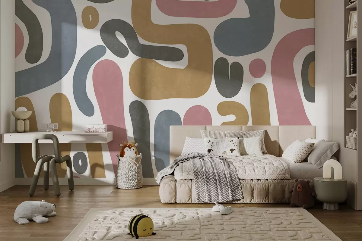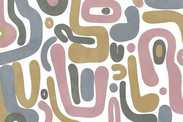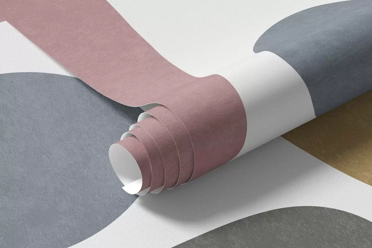 Фотошпалери Абстрактні текстуровані фігури в пастельно-рожевому, приглушеному синьому, гірчично-жовтому та сірому кольорах на білому тлі, сучасне мистецтво w09620