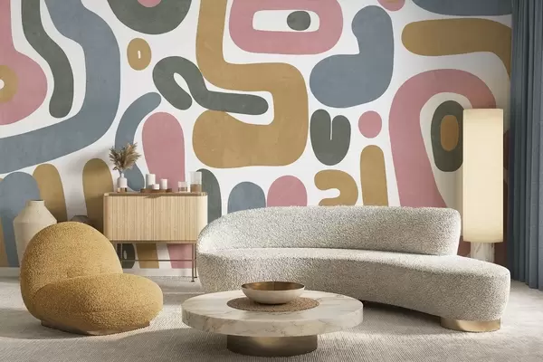 Фотошпалери Абстрактні текстуровані фігури в пастельно-рожевому, приглушеному синьому, гірчично-жовтому та сірому кольорах на білому тлі, сучасне мистецтво w09620