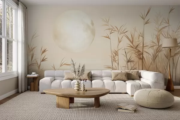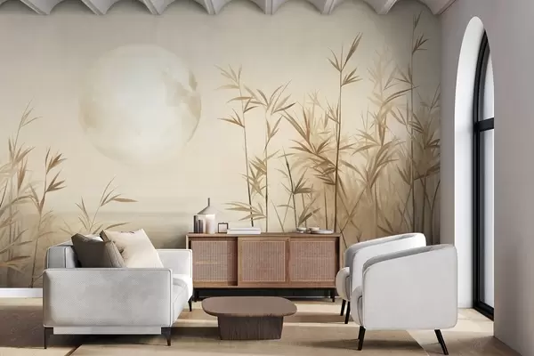 Фотошпалери Текстурований пейзаж з високим очеретом, озером і блідим місяцем на туманному небі w09631