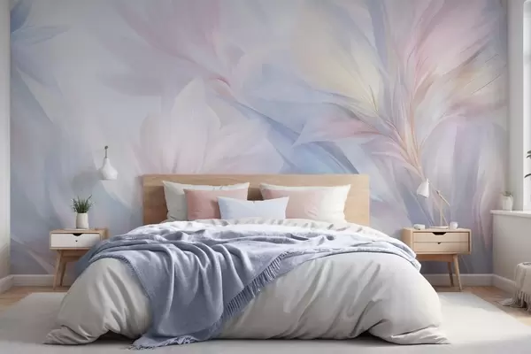 Фотошпалери М'які листя та пір'я пастельних кольорів у відтінках рожевого, блакитного та жовтого, абстрактний та фактурний принт w09634