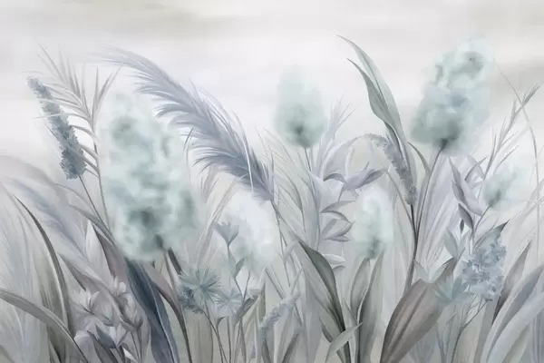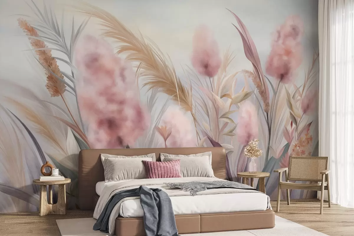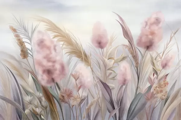 Фотошпалери Рожева та бежева трава пампасу та інші сухі квіти на тлі м'якого, туманного неба w09635