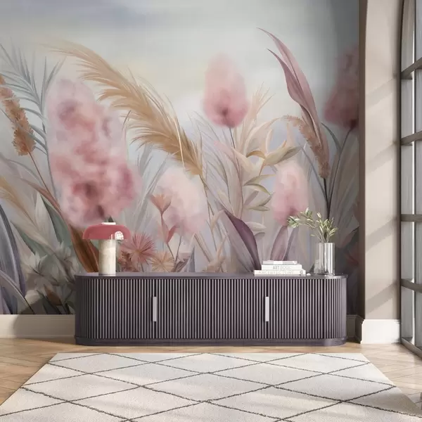 Фотошпалери Рожева та бежева трава пампасу та інші сухі квіти на тлі м'якого, туманного неба w09635