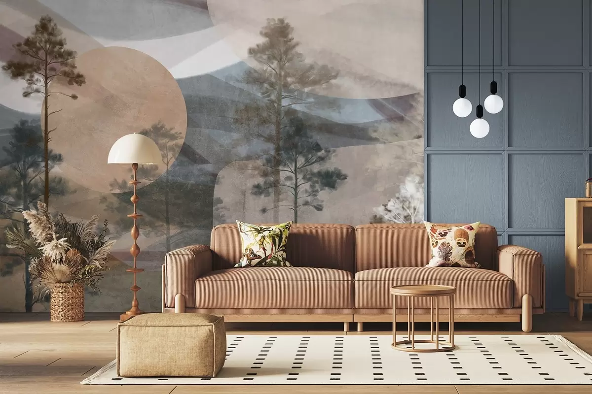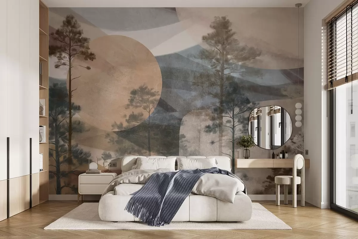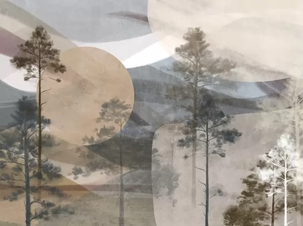 Фотошпалери Високі сосни в приглушеному текстурованому ландшафті з абстрактними круглими формами та багатошаровими горами в землистих тонах w09636