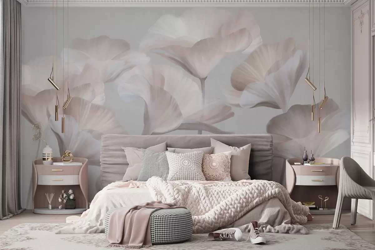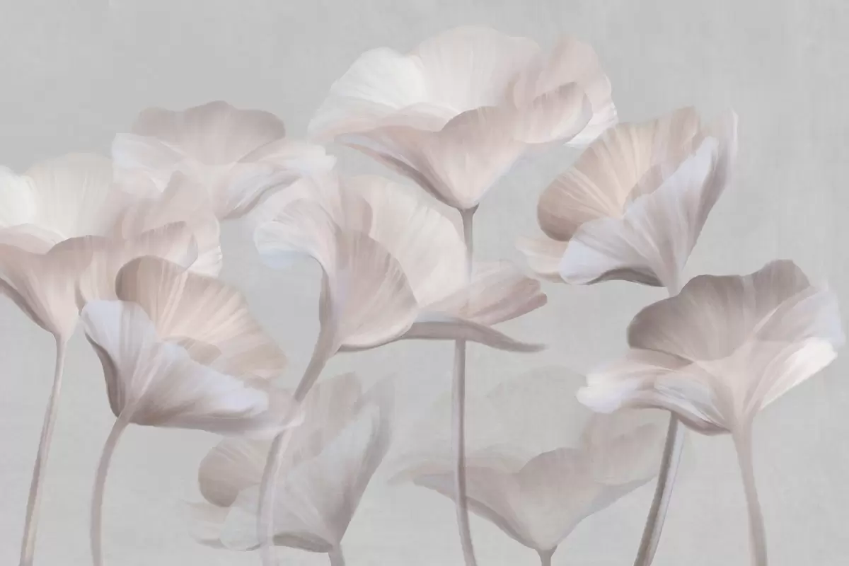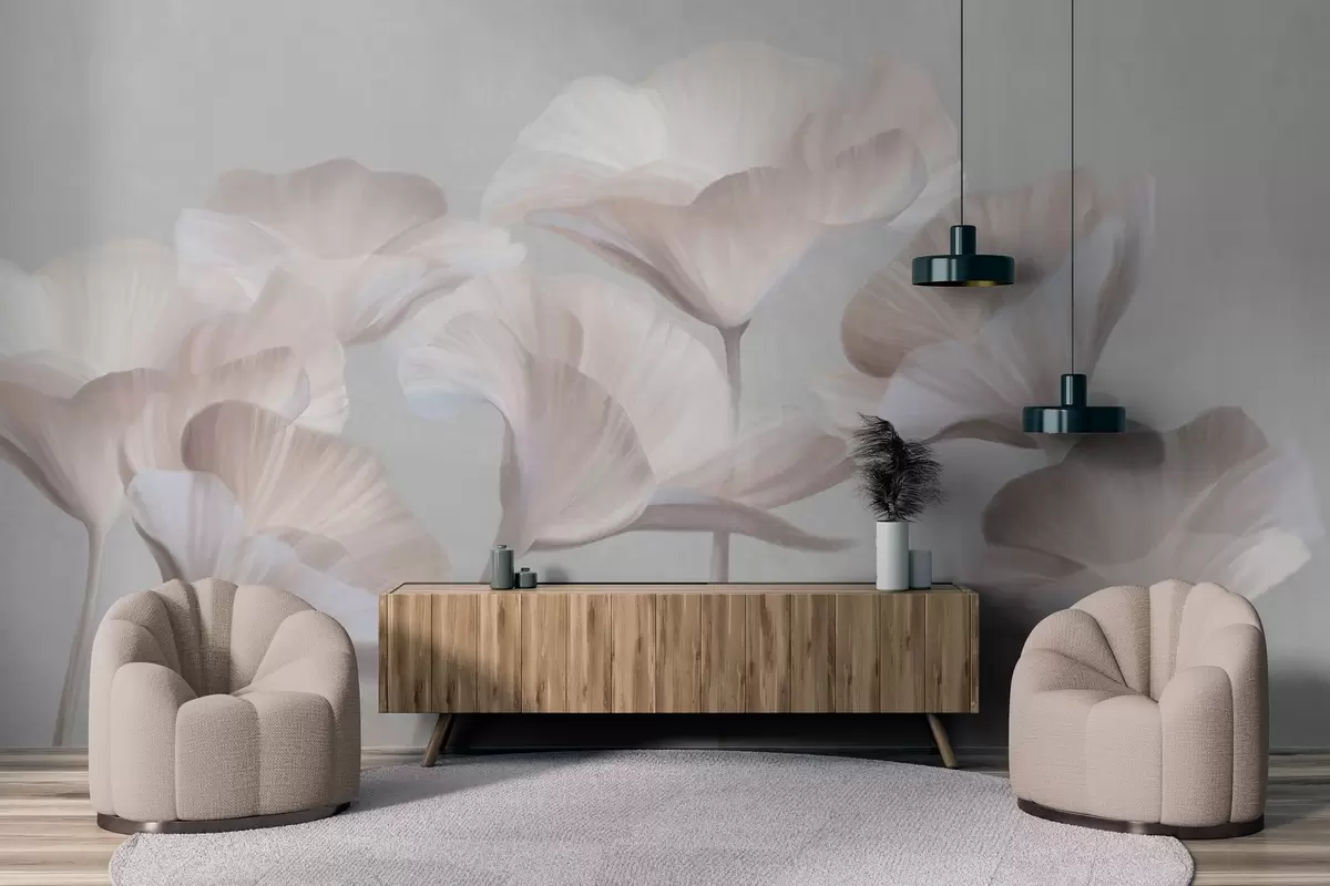 Фотошпалери Блідо-персикові напівпрозорі квіти лотоса з ніжними пелюстками на тлі приглушеного сірого фону w09640
