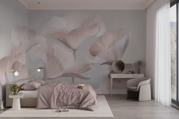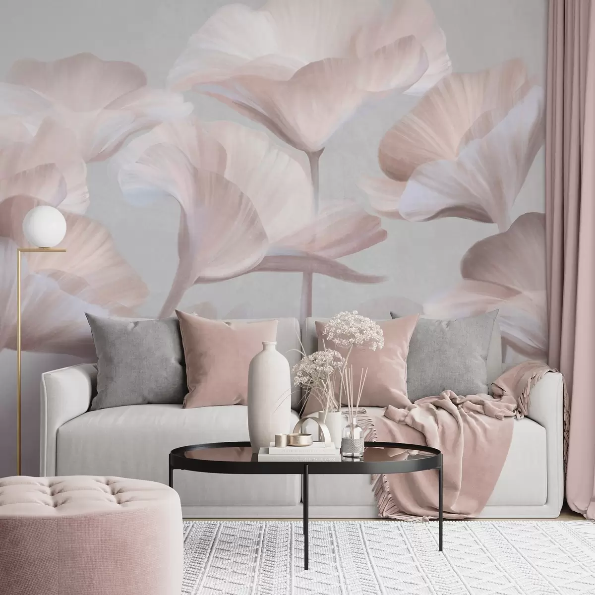 Фотошпалери Блідо-персикові напівпрозорі квіти лотоса з ніжними пелюстками на тлі приглушеного сірого фону w09640