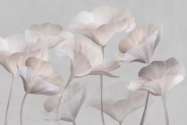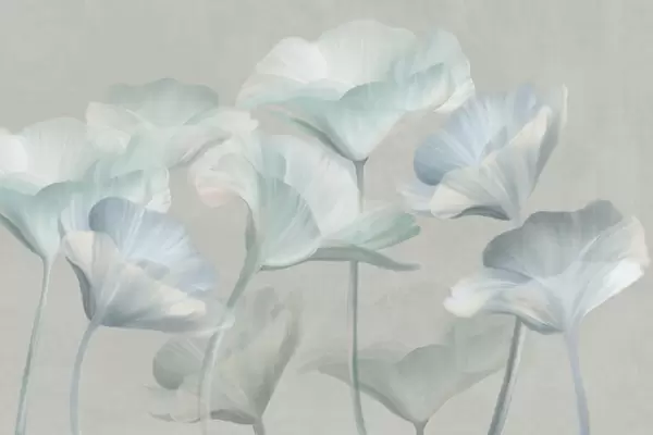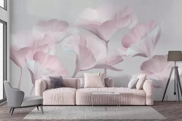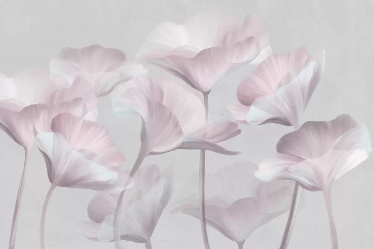 Фотошпалери Блідо-рожеві текстуровані напівпрозорі квіти лотоса з ніжними пелюстками на тлі приглушеного сірого фону w09640v1