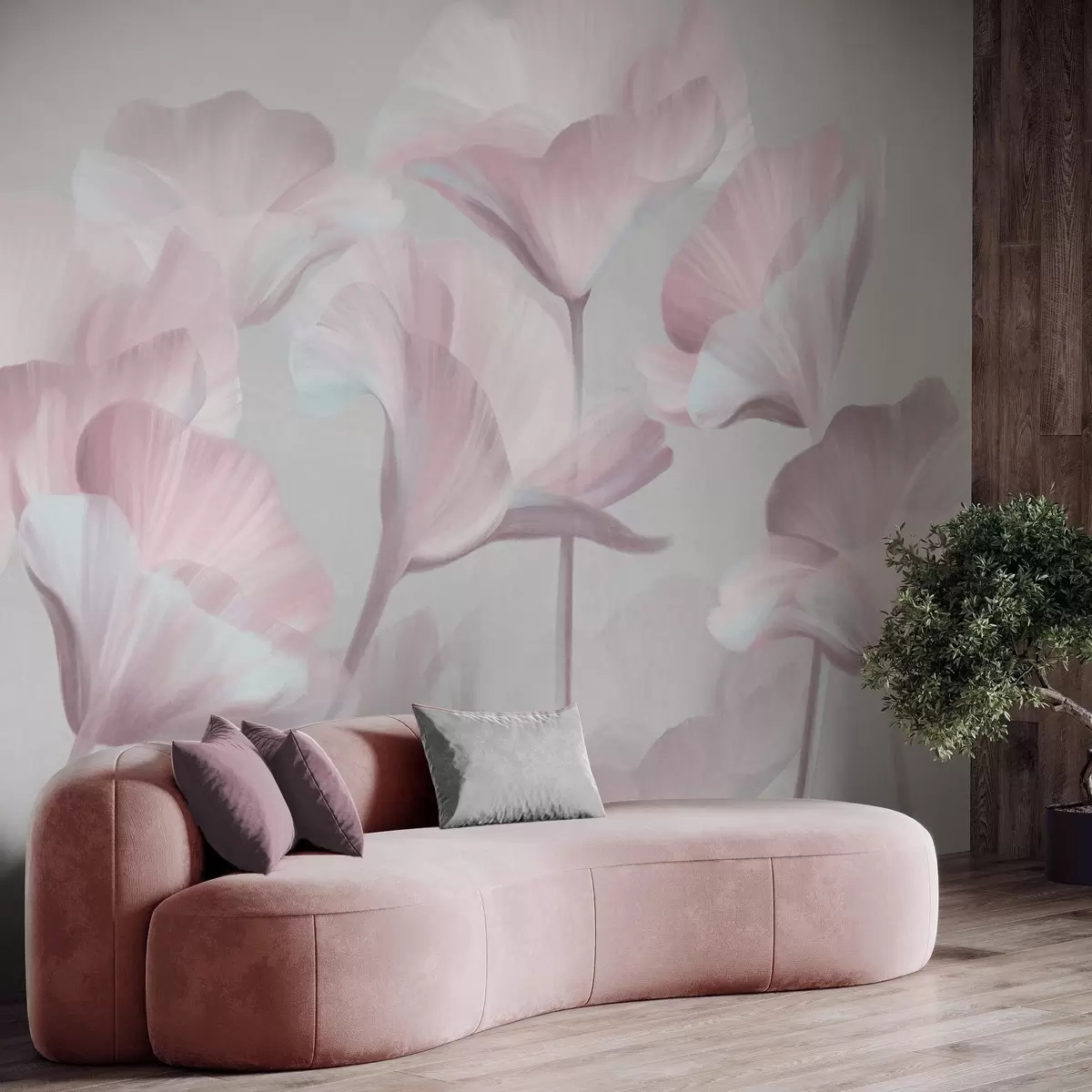 Фотошпалери Блідо-рожеві текстуровані напівпрозорі квіти лотоса з ніжними пелюстками на тлі приглушеного сірого фону w09640v1