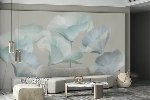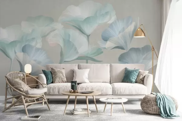 Фотошпалери Блідо-бірюзові прозорі квіти лотоса з ніжними пелюстками на тлі приглушеного сірого фону w09640v2