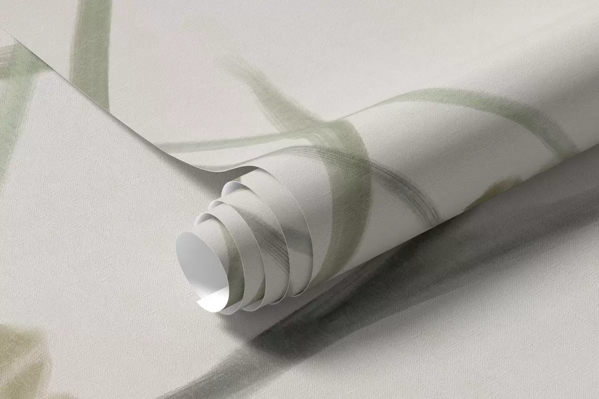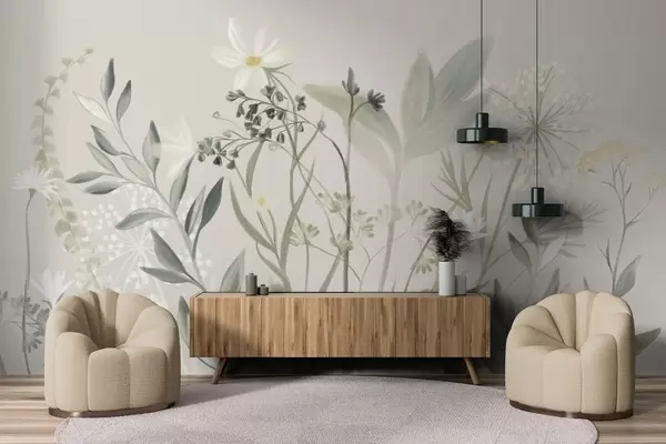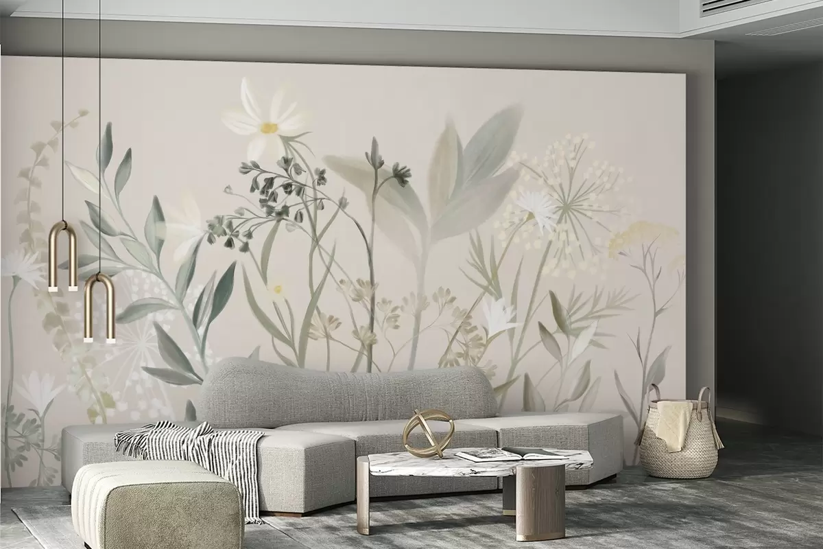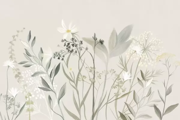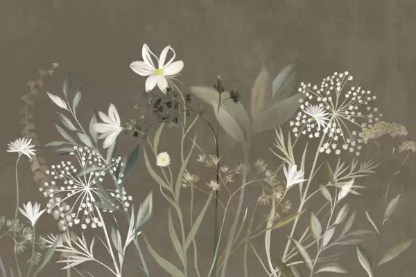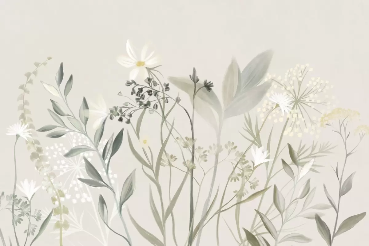 Фотошпалери Ніжні текстуровані польові квіти та листя в приглушених зелених і кремових тонах на м'якому бежевому тлі w09641