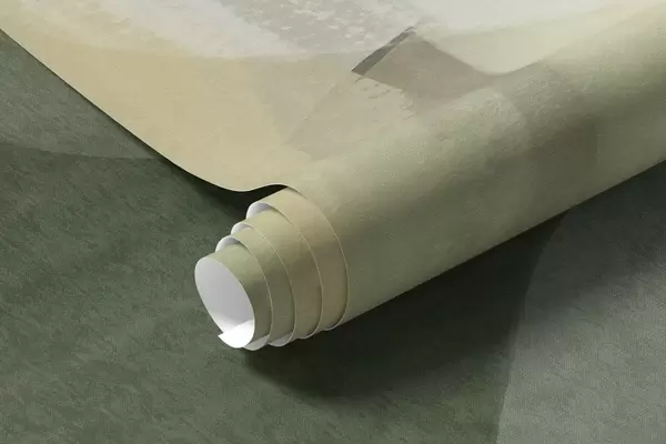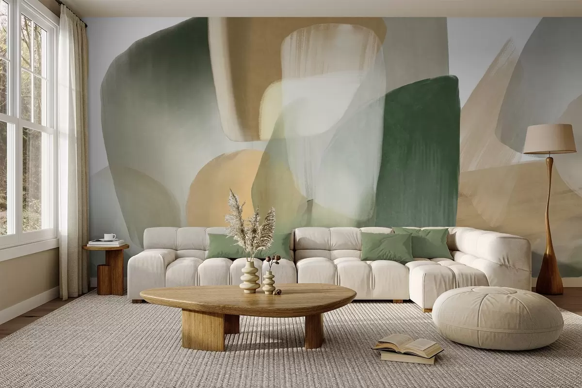 Фотошпалери Абстрактні текстурні фігури в приглушених зелених і бежевих кольорах, з м'якими краями і перекриваючимися шарами w09642