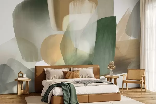 Фотошпалери Абстрактні текстурні фігури в приглушених зелених і бежевих кольорах, з м'якими краями і перекриваючимися шарами w09642