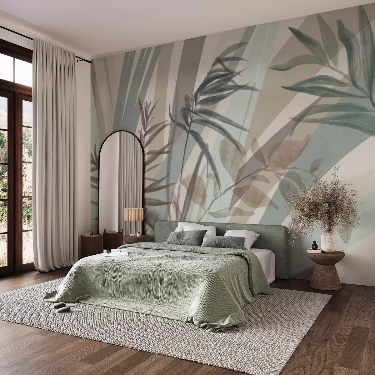 Фотошпалери Висока текстурована трава та листя в приглушених землистих тонах, з абстрактними лініями на тлі, що створюють органічний принт. w09643