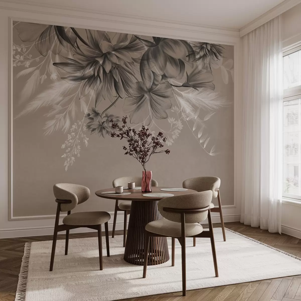 Фотошпалери Текстуровані квіти та папороті в відтінках темно-сірого та білого на тлі приглушеного бежевого фону стиль малювання w09644