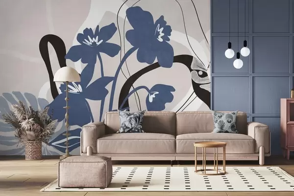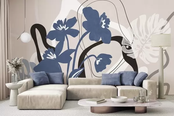 Фотошпалери Абстрактні текстуровані блакитні квіти з білими та чорними фігурами на світло-бежевому тлі, мінімалістичне мистецтво w09645