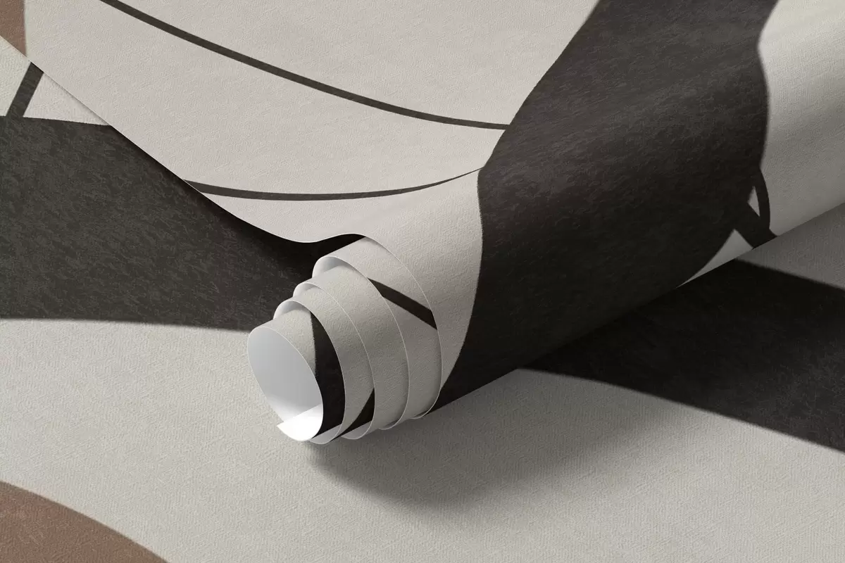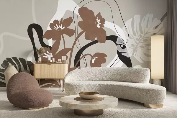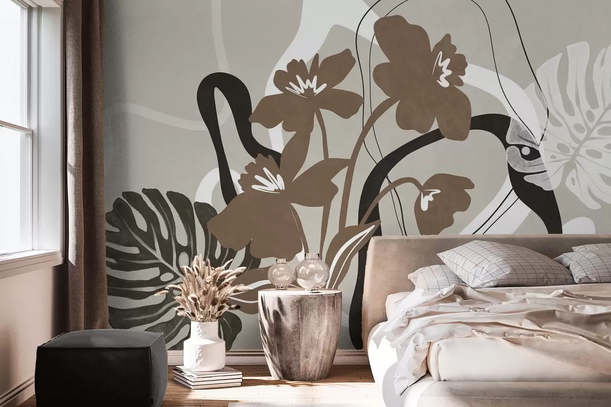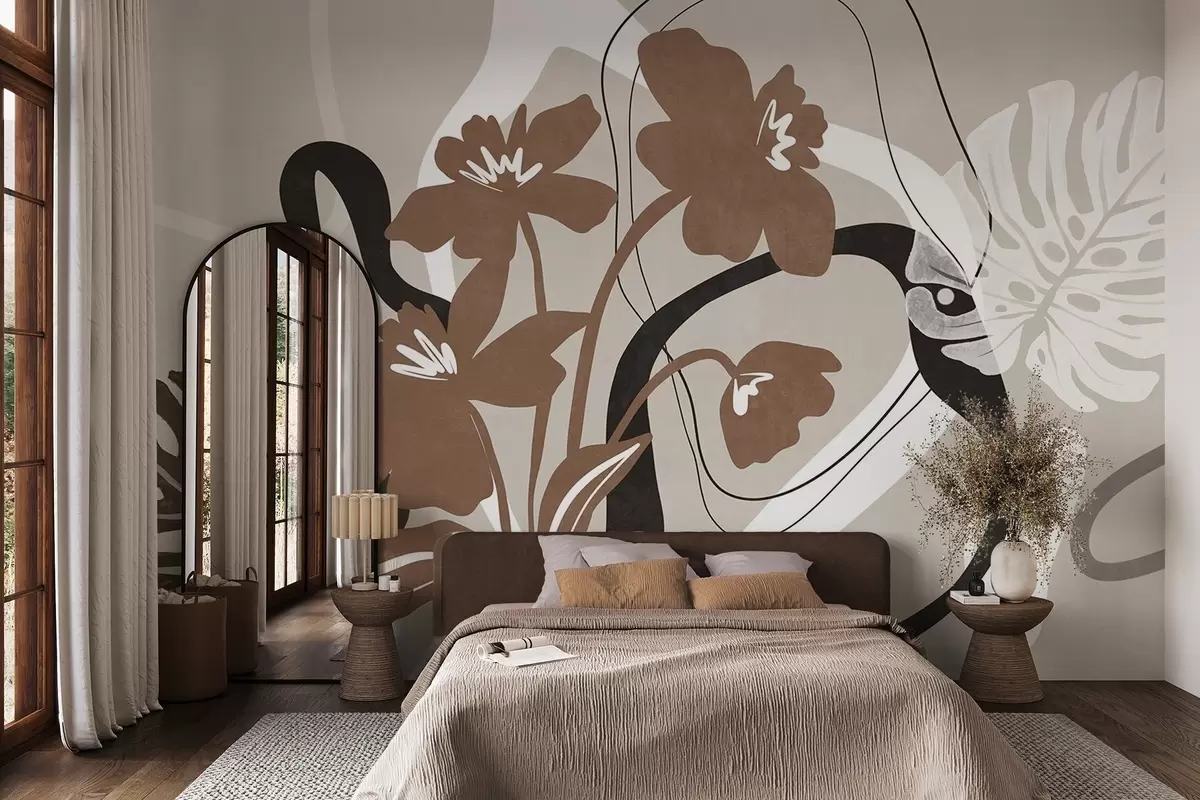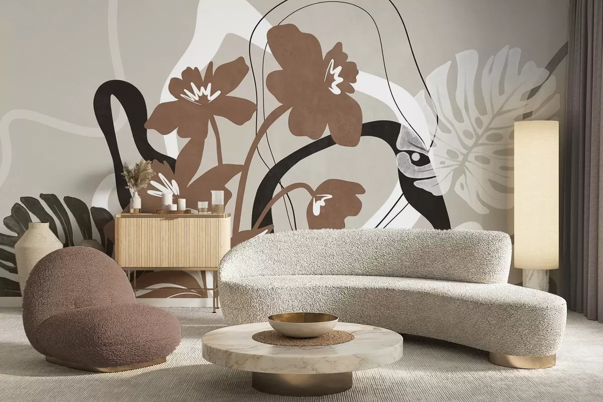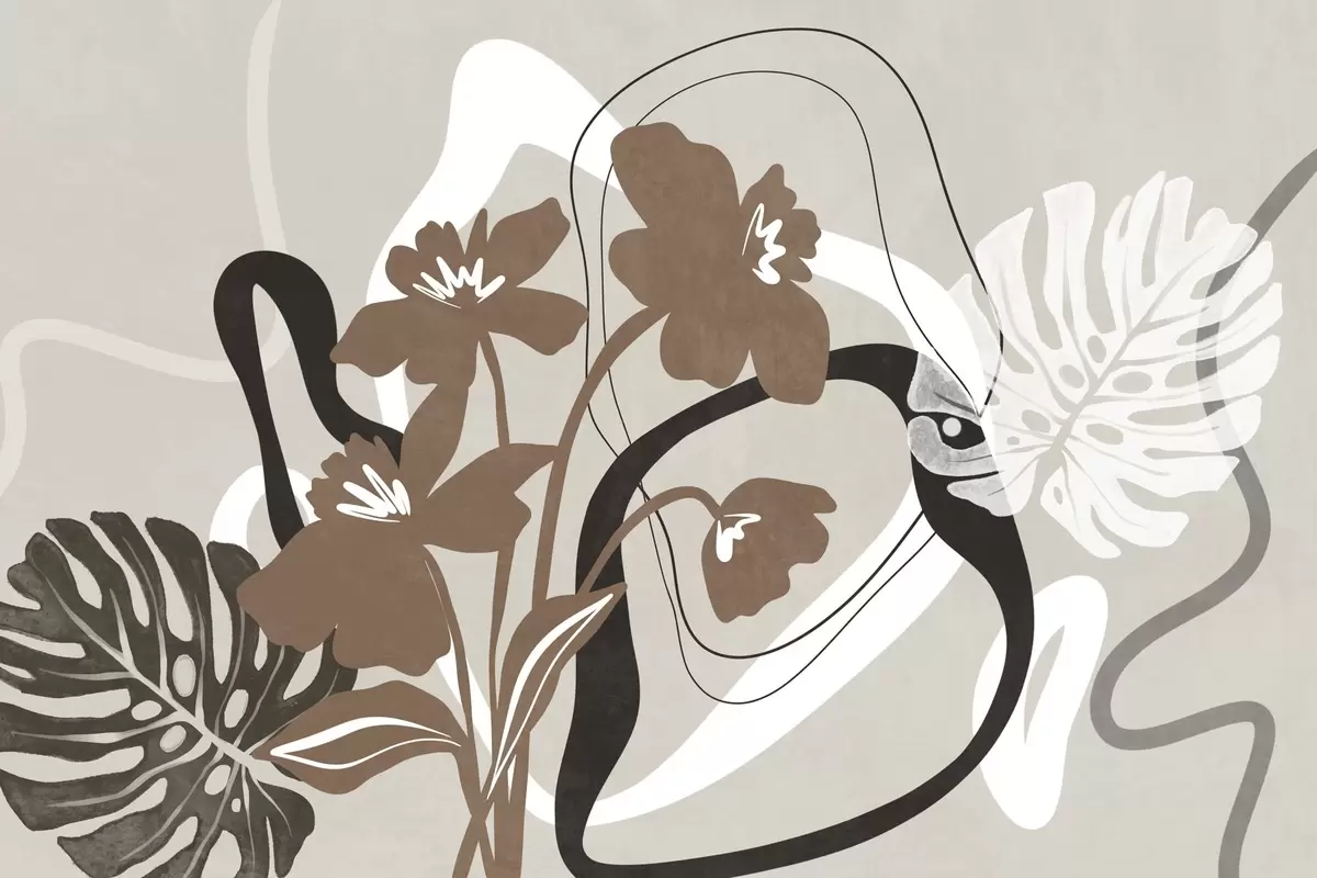 Фотошпалери Абстрактні текстуровані коричневі квіти з білими та чорними фігурами на бежевому тлі, мінімалістичне мистецтво w09645v1