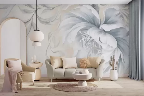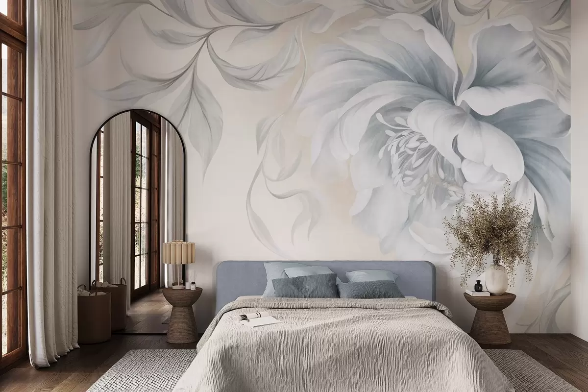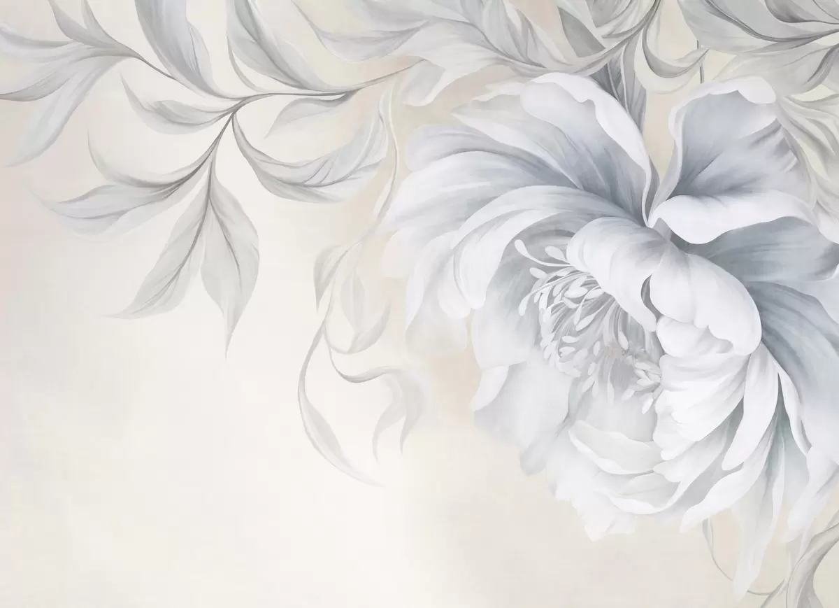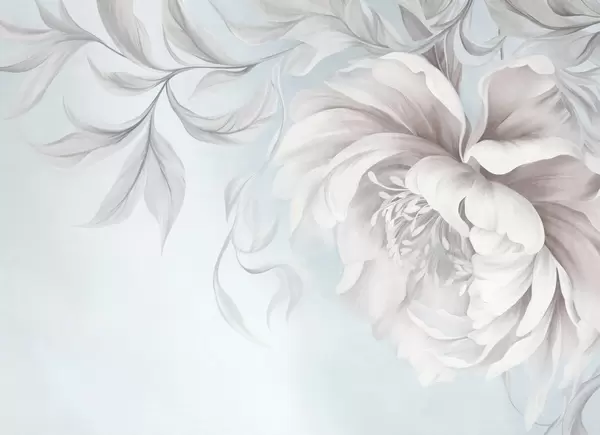 Фотошпалери Велика півонія з рельєфною поверхнею, ніжними пелюстками та сірим листям, виконана у м'якому стилі w09647