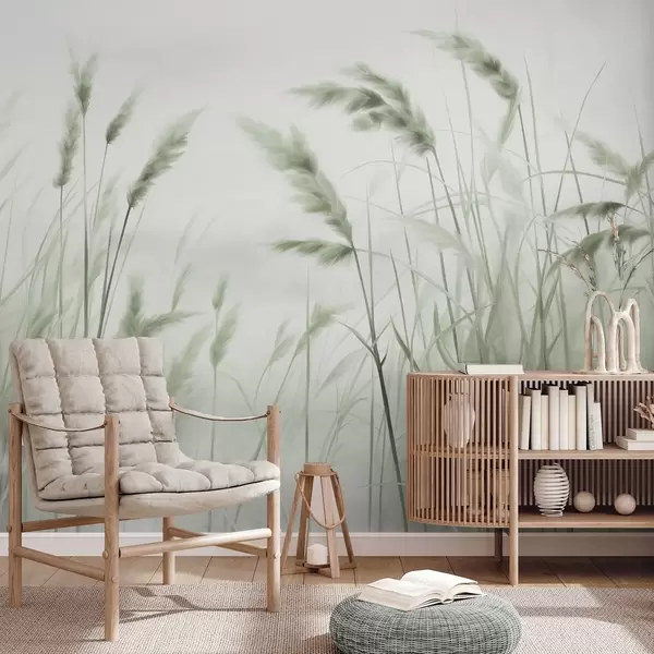 Фотошпалери Висока, текстурована суха трава з колосками пшениці на полі на тлі м'якого, блідого фону w09648v1