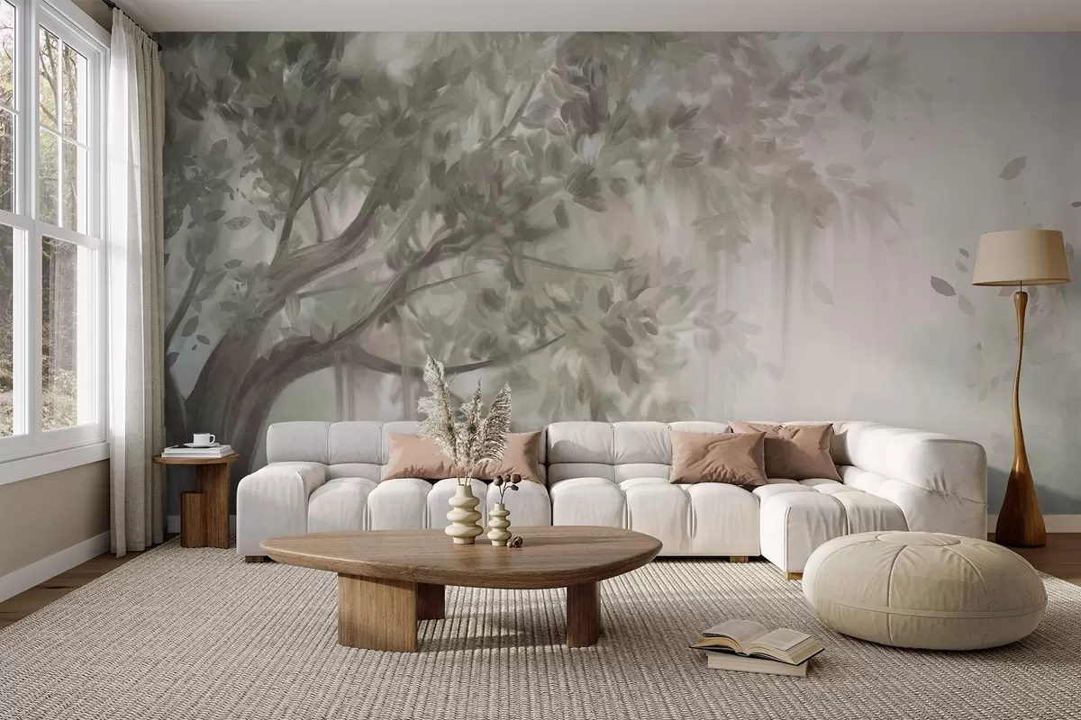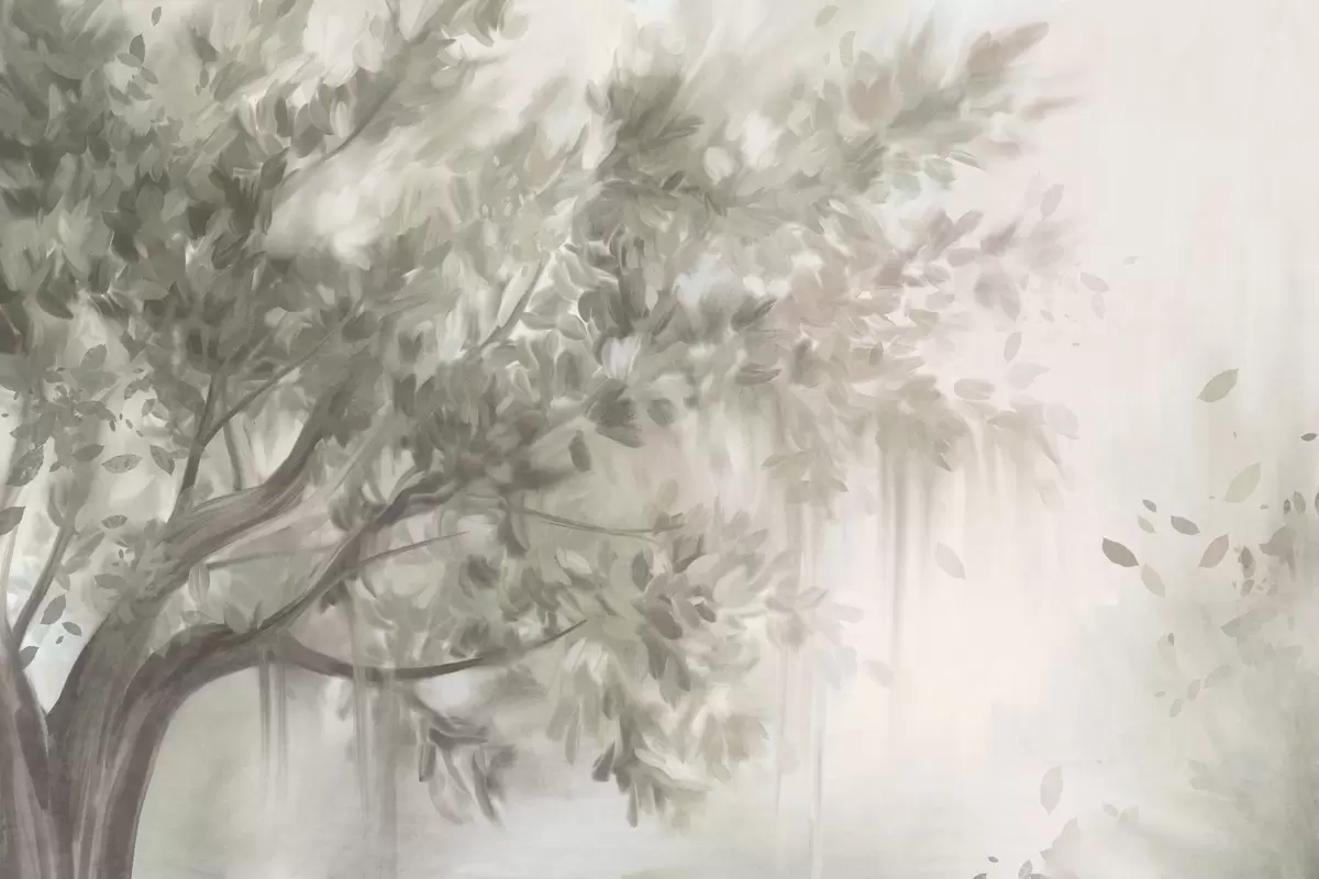 Фотошпалери Текстуроване дерево з світло-зеленим листям і гілками, з м'яким, розмитим фоном w09650