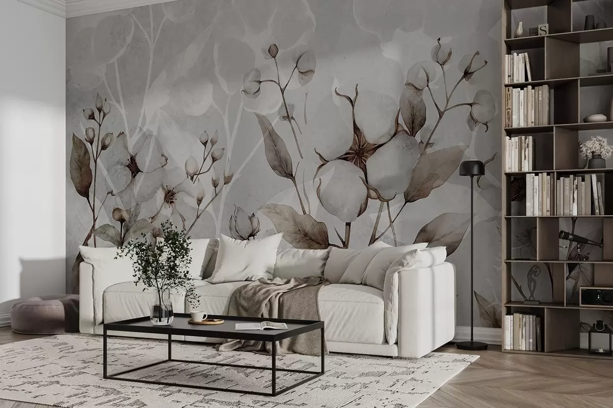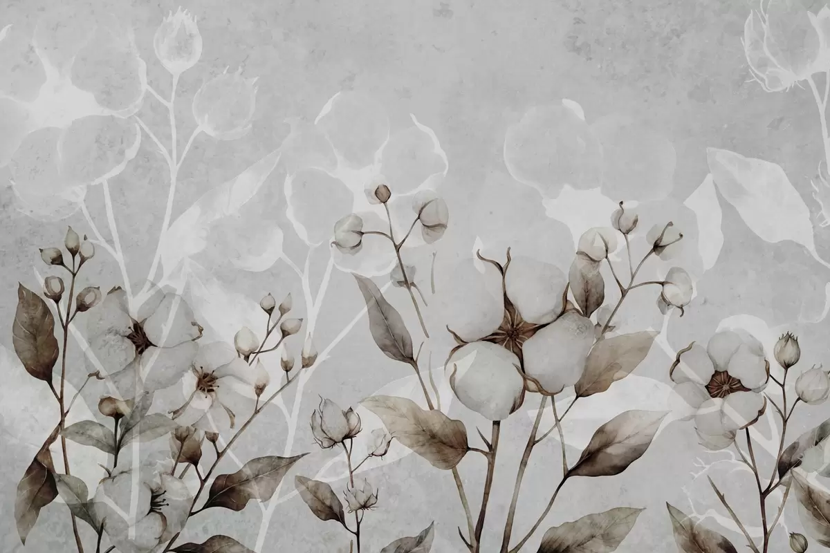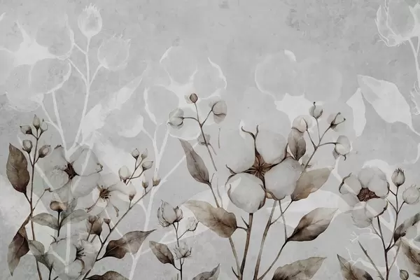 Фотошпалери Великі бавовняні квіти на світло-сірому тлі w09691