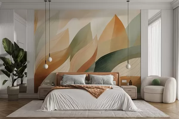 Фотошпалери Абстрактні листя, приглушені землисті відтінки зеленого, помаранчевого з ніжними лінійними деталями, м'яка акварельна текстура w09736