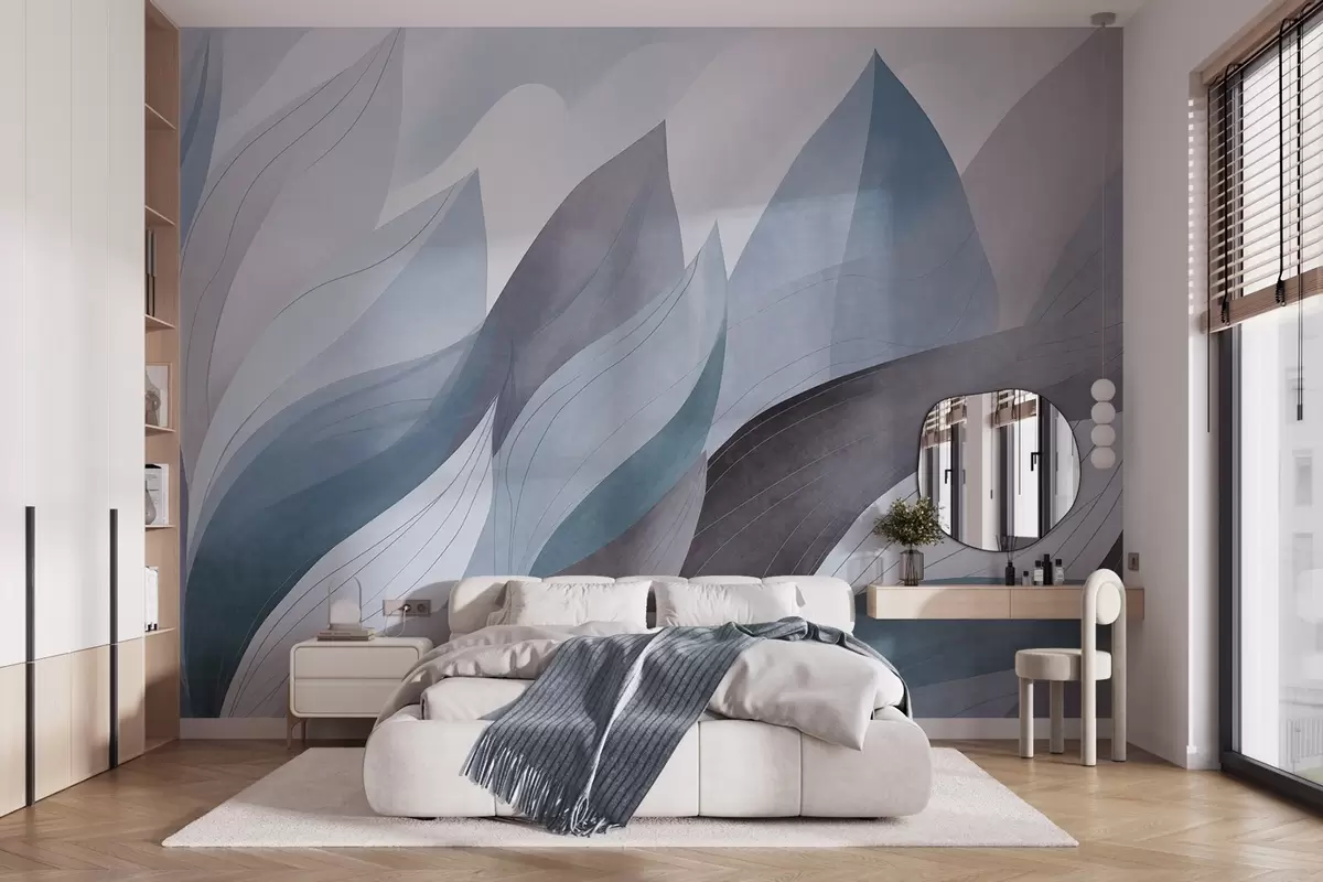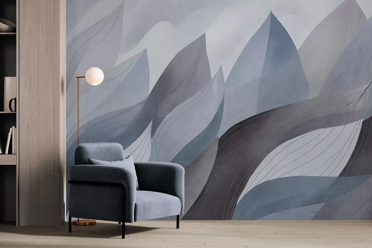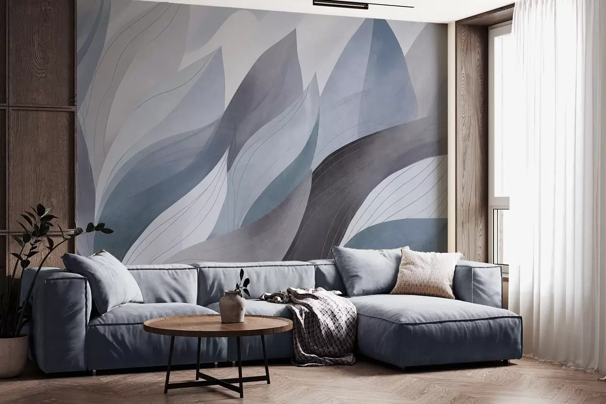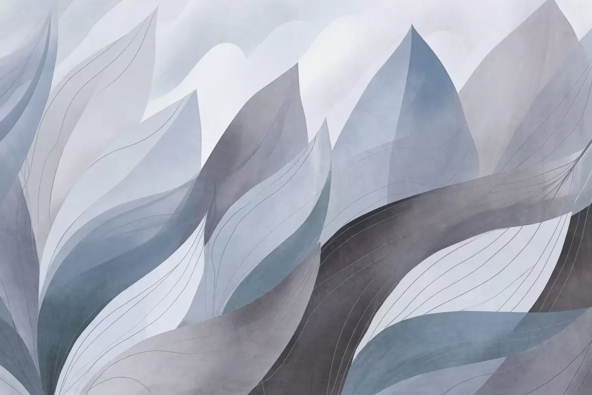 Фотошпалери Абстрактні листя, приглушені землисті відтінки синього з ніжними лінійними деталями, м'яка акварельна текстура w09736v1