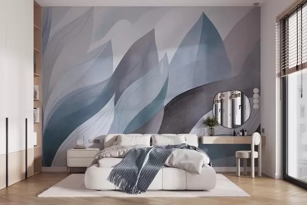 Фотошпалери Абстрактні листя, приглушені землисті відтінки синього з ніжними лінійними деталями, м'яка акварельна текстура w09736v1