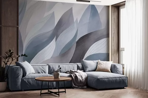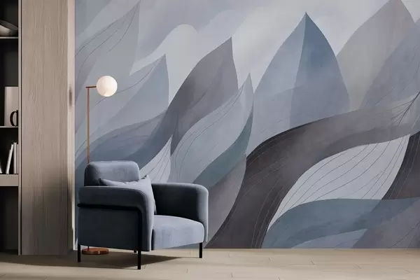 Фотошпалери Абстрактні листя, приглушені землисті відтінки синього з ніжними лінійними деталями, м'яка акварельна текстура w09736v1