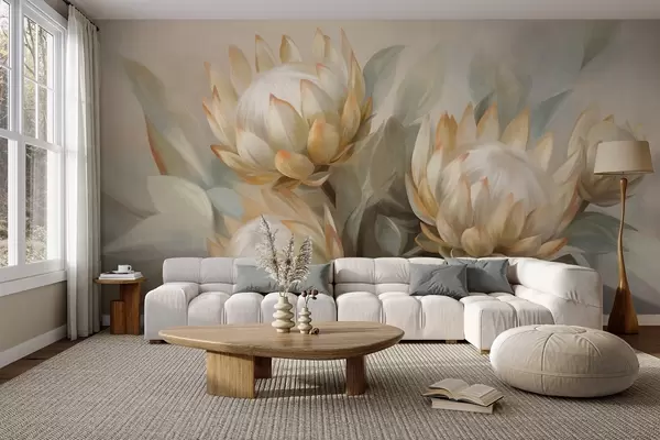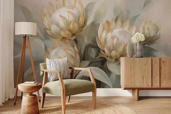 Фотошпалери Текстуровані квіти протеї з зеленим листям і м'яким, розмитим фоном w09738