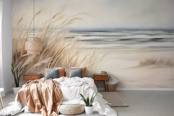 Фотошпалери Текстурований пейзаж із сухою травою на піщаному пляжі, з океаном і небом на задньому плані w09739
