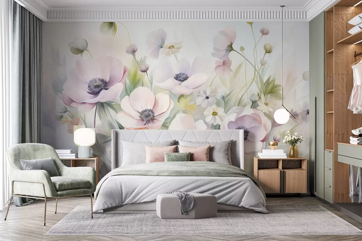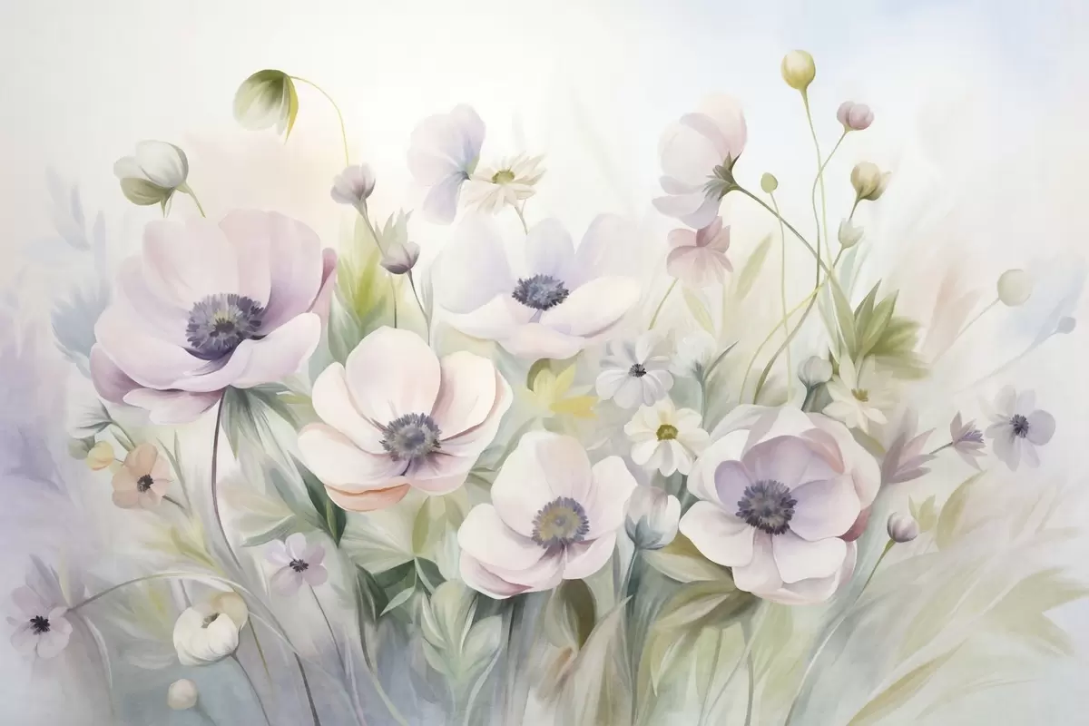 Фотошпалери Поле з пастельно-рожевими та білими квітами анемонів, зеленим листям та маленькими білими ромашками w09742