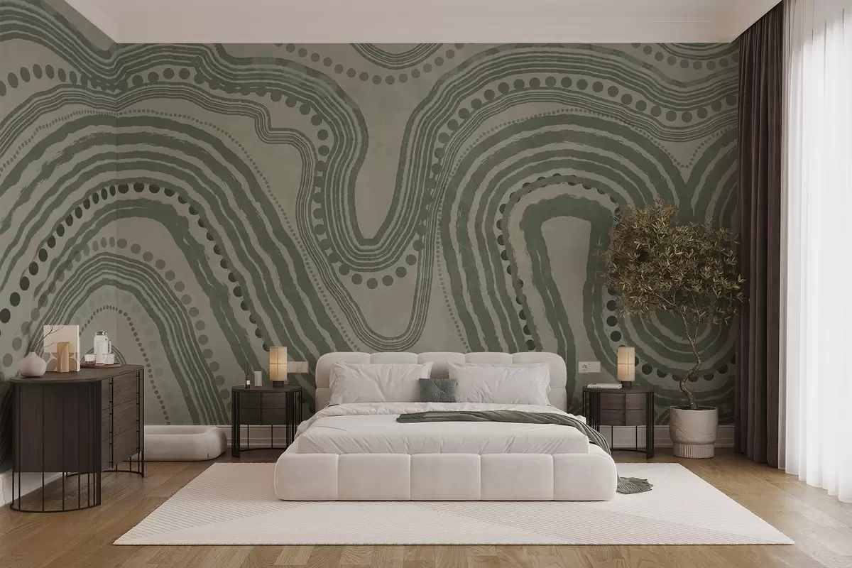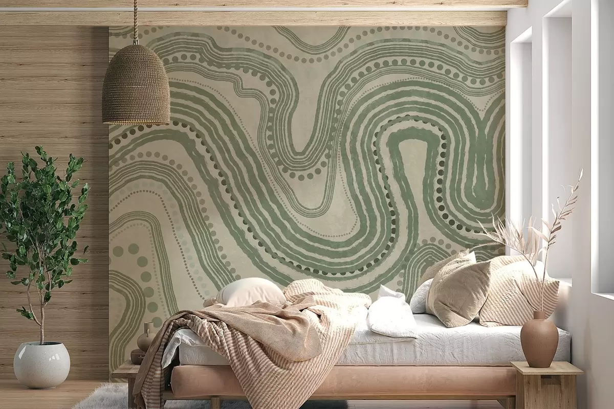Фотошпалери Абстрактні зелені та бежеві хвилясті лінії та крапки, сучасне текстуроване мистецтво w09747