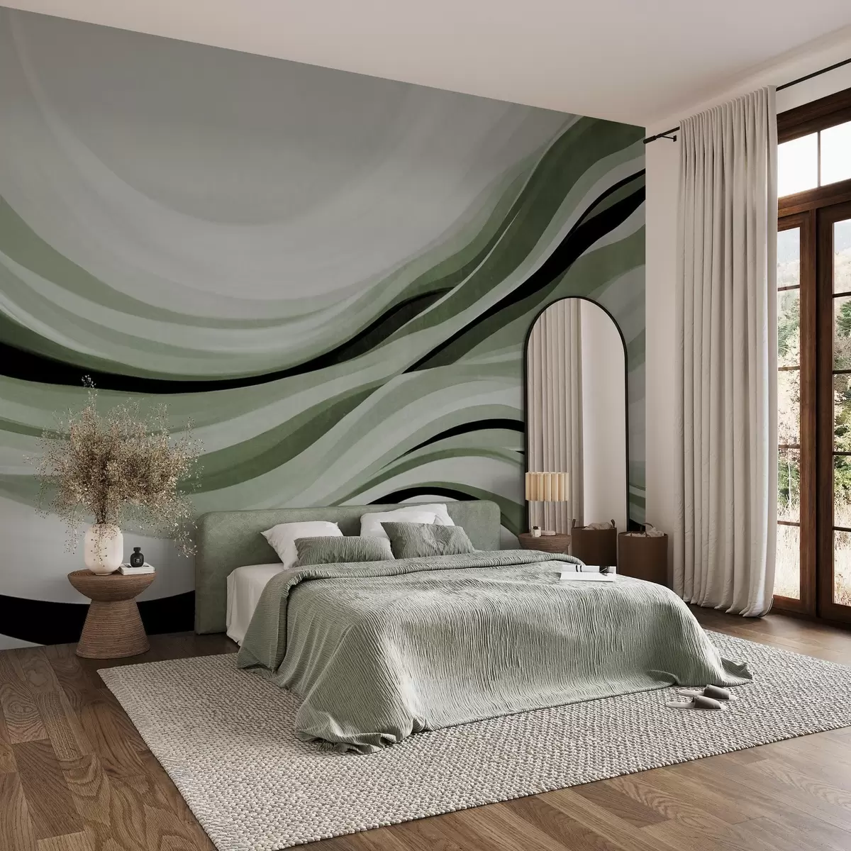 Фотошпалери Абстрактні хвилясті лінії в відтінках зеленого і чорного на світлому тлі, фактурне мистецтво w09748v1