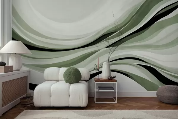 Фотошпалери Абстрактні хвилясті лінії в відтінках зеленого і чорного на світлому тлі, фактурне мистецтво w09748v1
