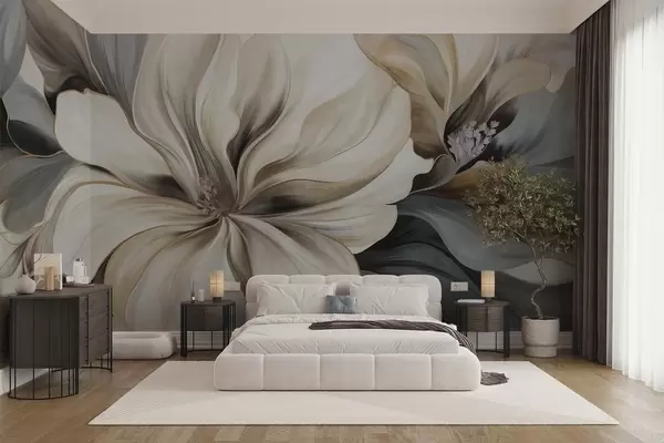 Фотошпалери Великі кремові квіти магнолії з коричневими та сірими листям, м'яке освітлення, абстрактний фон w09749