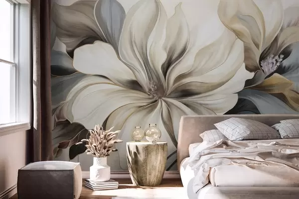 Фотошпалери Великі кремові квіти магнолії з коричневими та сірими листям, м'яке освітлення, абстрактний фон w09749