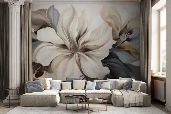Фотошпалери Великі кремові квіти магнолії з коричневими та сірими листям, м'яке освітлення, абстрактний фон w09749