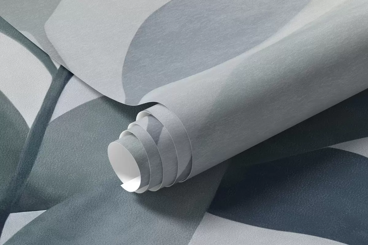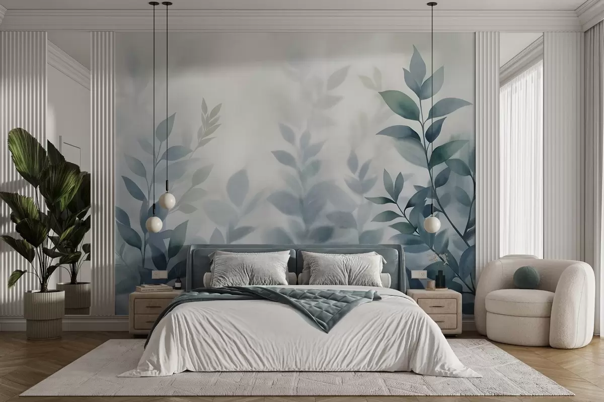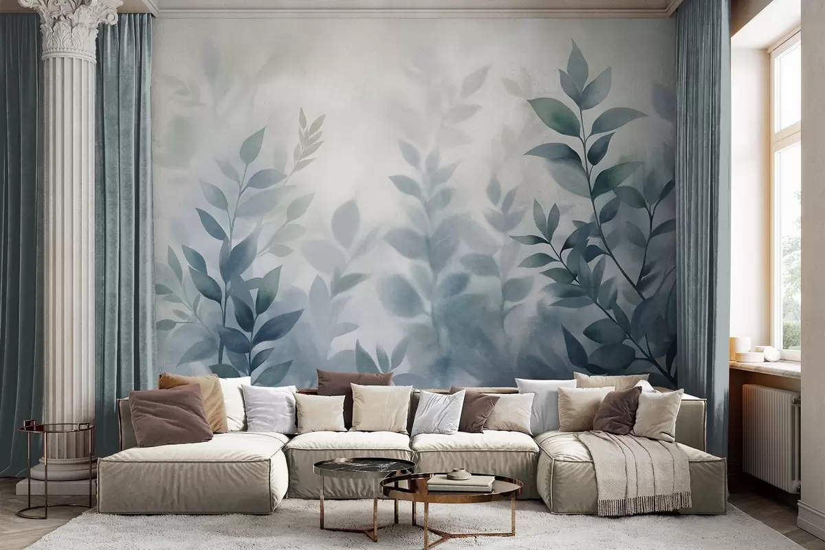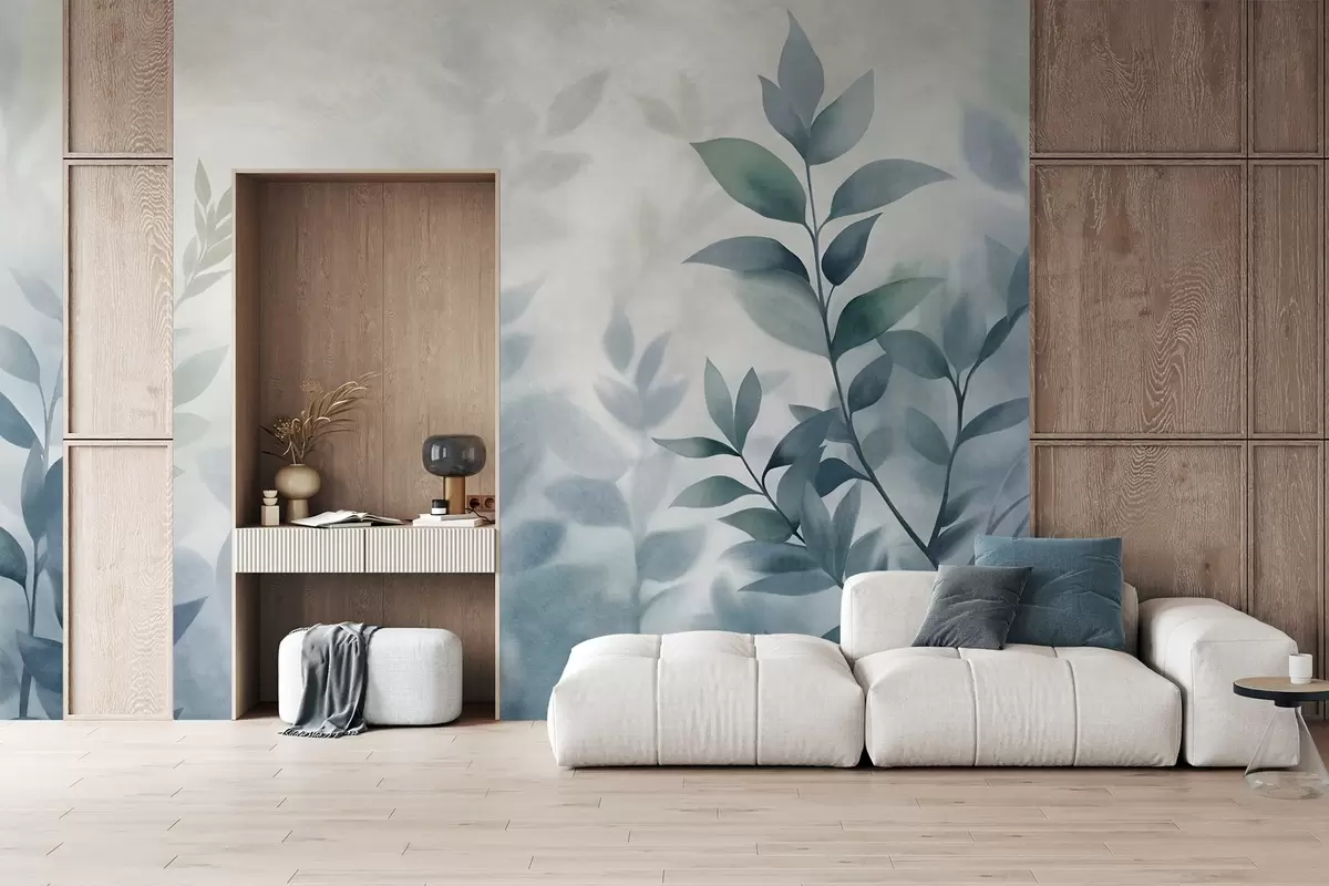 Фотошпалери Ніжні гілки з приглушеним синім листям, стиль акварельного живопису, фактурне мистецтво w09750v1