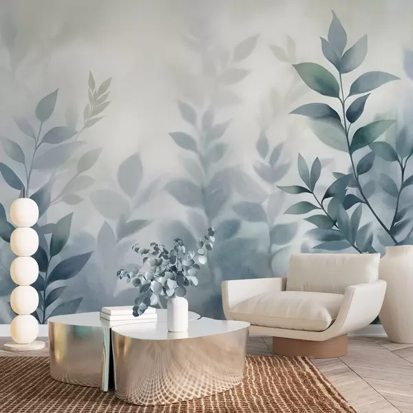 Фотошпалери Ніжні гілки з приглушеним синім листям, стиль акварельного живопису, фактурне мистецтво w09750v1
