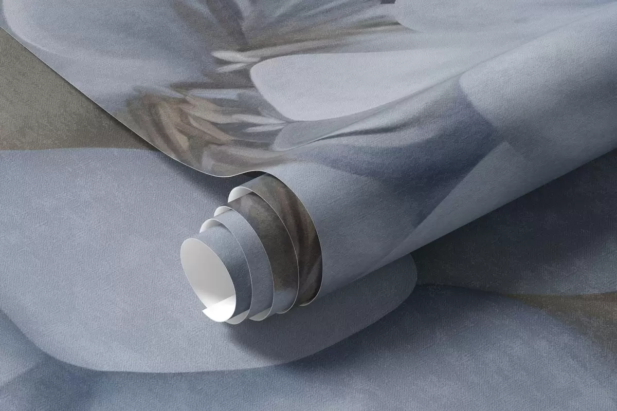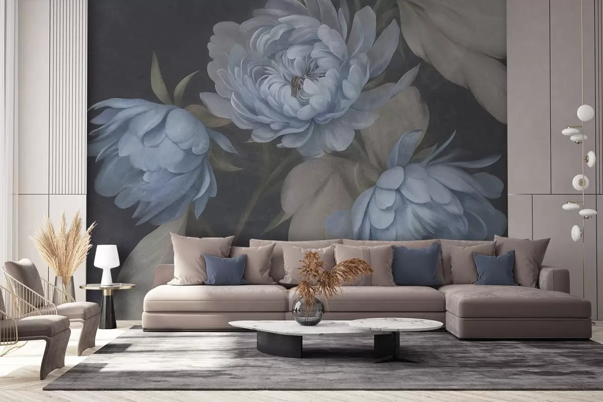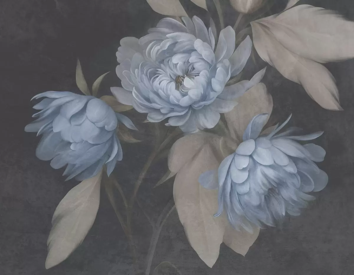 Фотошпалери Текстуровані світло-блакитні квіти півонії з бежевим листям на темному тлі w09751