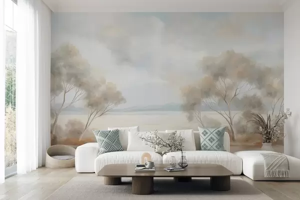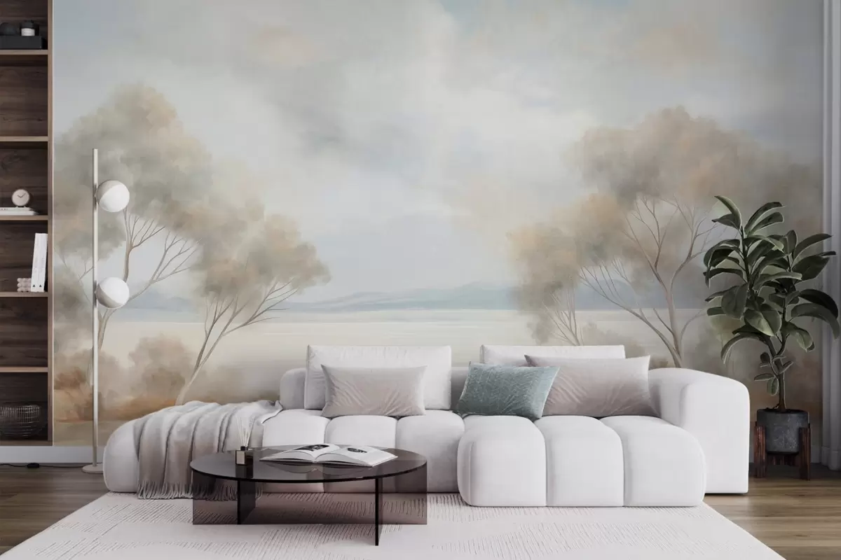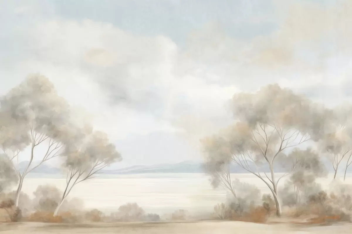 Фотошпалери Пейзажний стиль живопису з деревами під хмарним небом w09753
