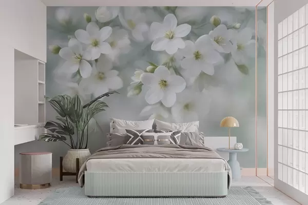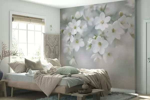 Фотошпалери Ніжні білі квіти з витонченою фактурою, м'яко розмиті на задньому плані w09759