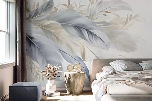 Фотошпалери Текстуровані пастельні пір'їнки та ніжні листочки на світлому тлі w09763
