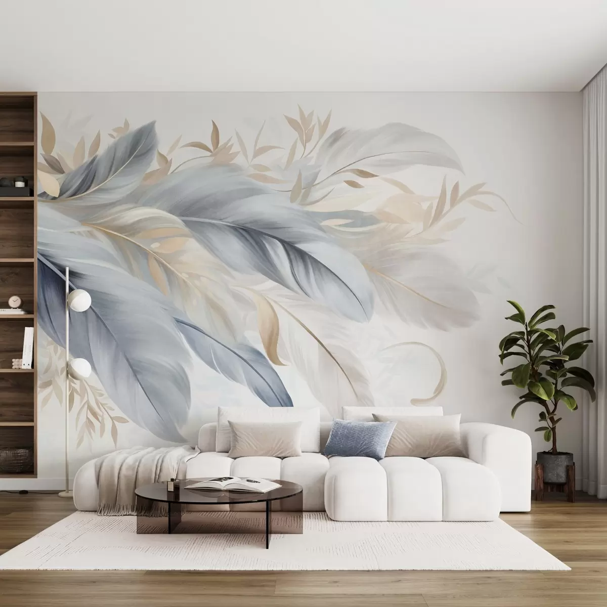 Фотошпалери Текстуровані пастельні пір'їнки та ніжні листочки на світлому тлі w09763