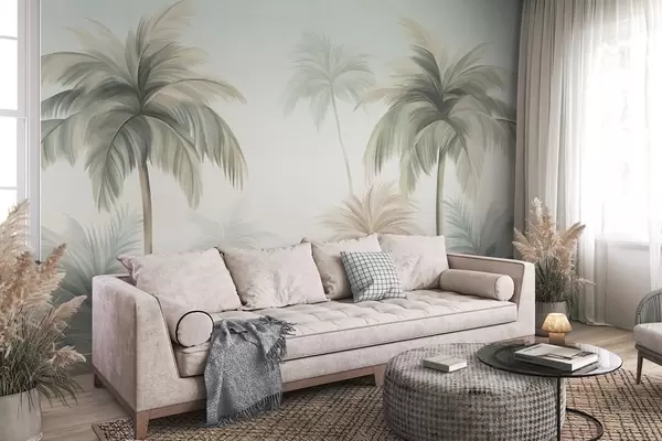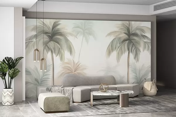Фотошпалери Пальми з текстурованими кронами, приглушеного зеленого та бежевого кольорів, на тлі м'якого неба w09770