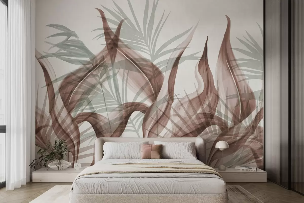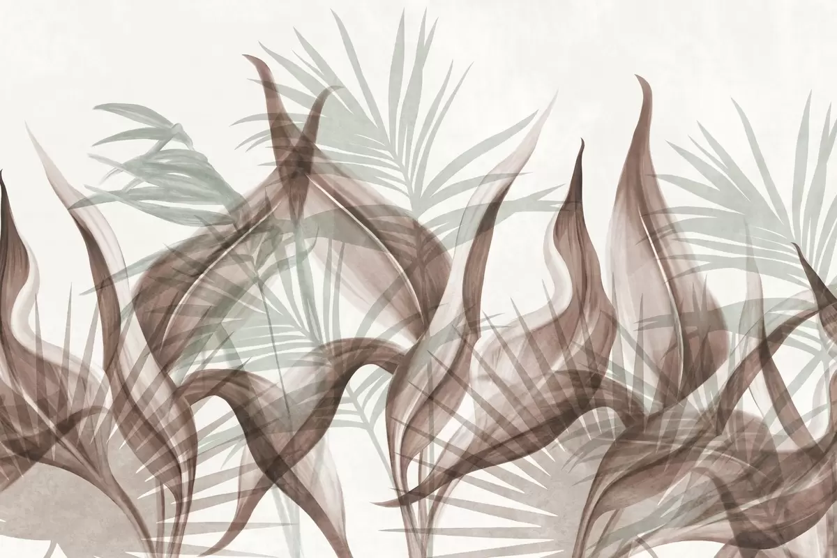 Фотошпалери Тропічне листя в відтінках коричневого і зеленого на білому тлі, текстурований акварельний стиль w09772