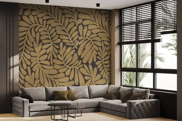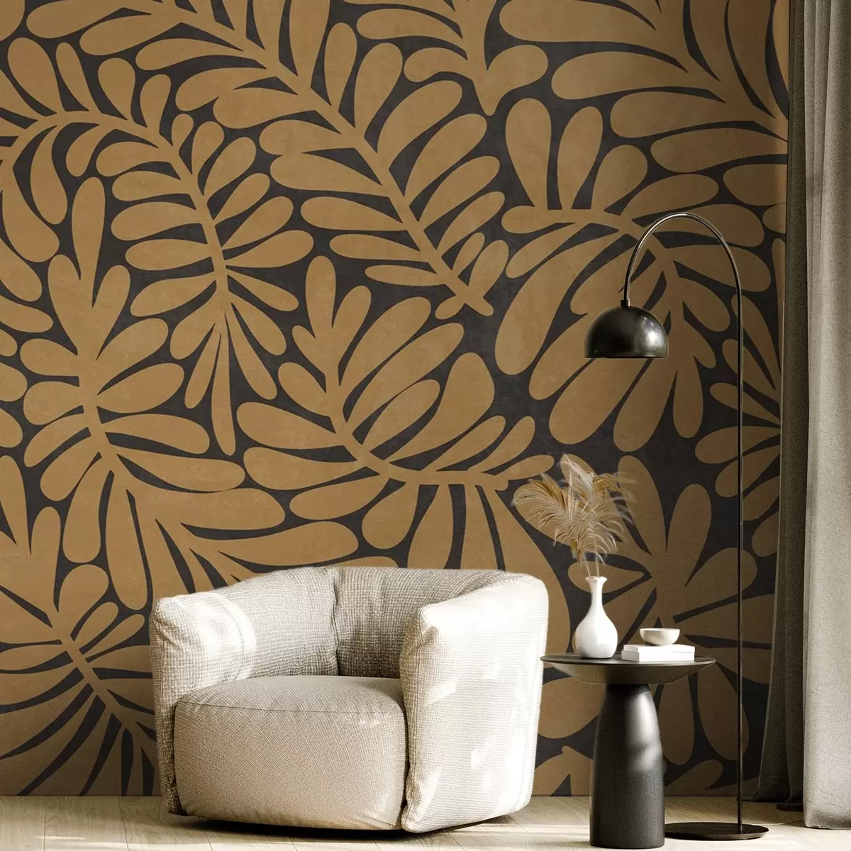 Фотошпалери Стилізоване зображення гірчично-жовтих листів на темно-сірому тлі, текстурована ілюстрація w09775