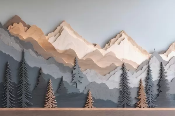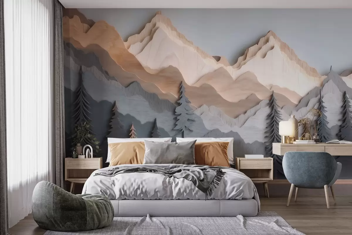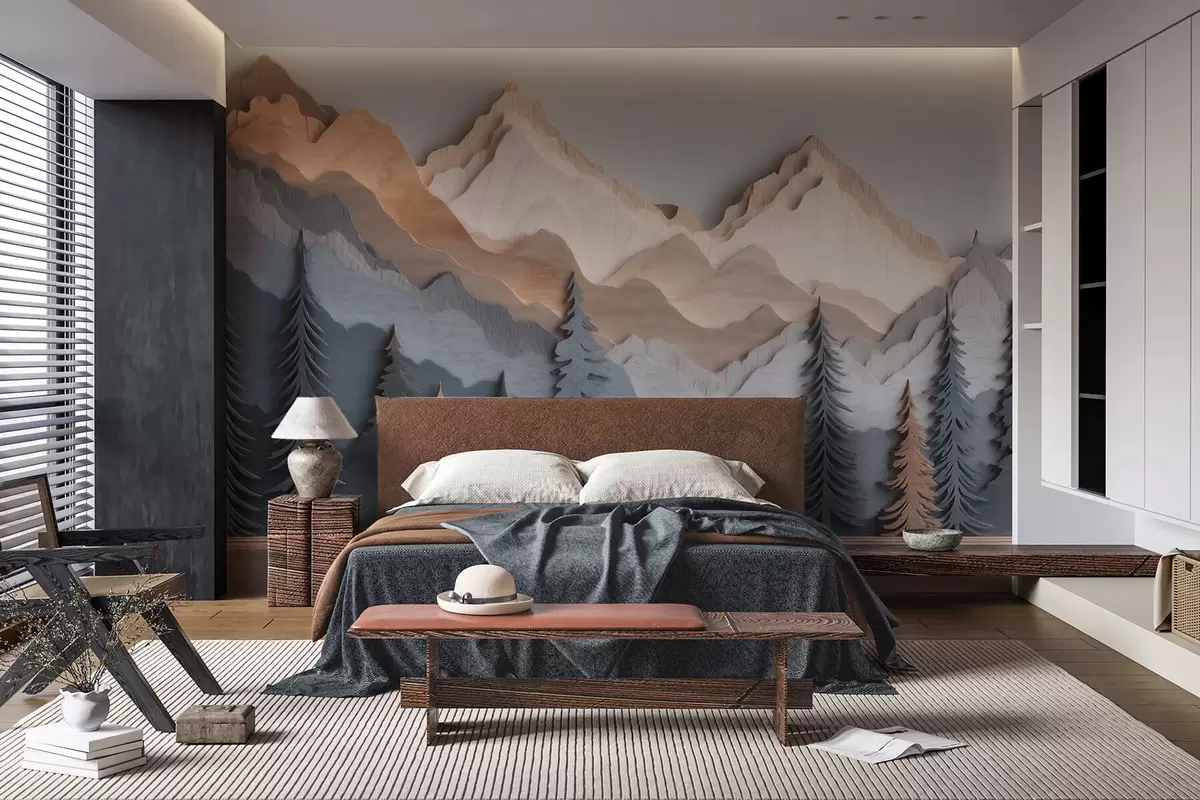 Фотошпалери Природний пейзаж із соснами та горами у стилі різьбленого дерева w09793
